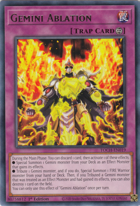 • Tribute 1 Gemini monster, and if you do, Special Summon 1 FIRE Warrior monster from your hand or Deck. Then, if you Tributed a Gemini monster that was treated as an Effect Monster and had gained its effects, you can also destroy 1 card on the field.