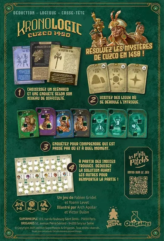 Résolvez les enquêtes à Cuzco, en 1450. Enquêtrices, enquêteurs, c’est à vous de démêler une série de mystères inexpliquées qui ont toutes eu lieu à Cuzco, au Pérou. Chacune des enquêtes, à la complexité variable, mettra à l’épreuve votre perspicacité et vos compétences de déduction logique. Qui ? Où ? Quand ? Votre objectif est de résoudre chaque mystère avant les autres, et de rétablir la vérité.