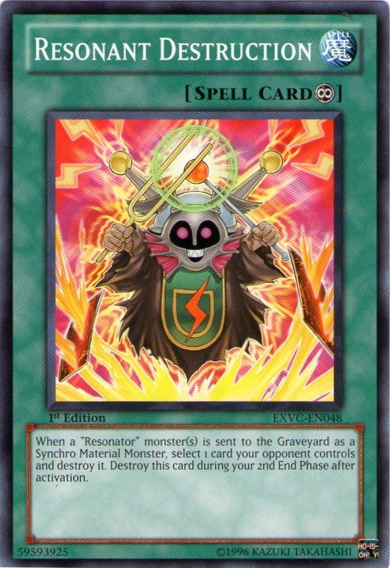 When a "Resonator" monster(s) is sent to the graveyard as a Synchro Material Monster, select 1 card your opponent controls and destroy it. Destroy this card during your 2ns End Phase after activation.