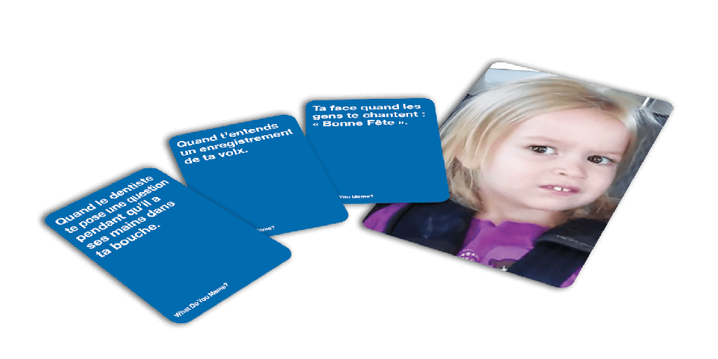 COMMENT JOUER : Rivalise avec les membres de ta famille pour créer les Memes les plus drôles. Pour ce faire, utilise l’une de tes cartes de légende distribuées pour sous-titrer la carte photo proposé à chaque tour.
