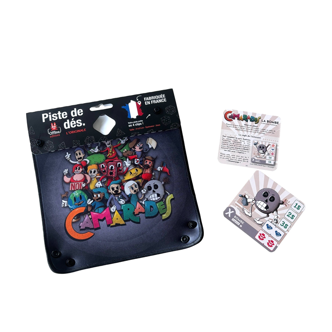 La piste de dé à l'effigie du jeu de société Camarades. La piste contient dans son packaging l'extension La bombe (une carte) pouvant offrir une victoire immédiate, encore faut il que vous parveniez à activer La Bombe et que personne ne parvienne à la désamorcer...