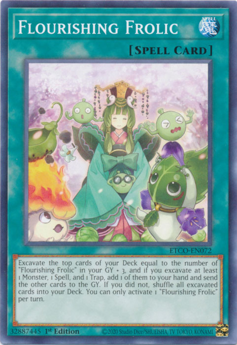 Excavate cards from your Deck equal to the number of "Flourishing Frolic" in your GY + 3, and if you excavate at least 1 Monster, 1 Spell, and 1 Trap, add 1 of them to your hand and send the other cards to the GY. If you did not, shuffle all excavated cards into your Deck. You can only activate 1 "Flourishing Frolic" per turn.