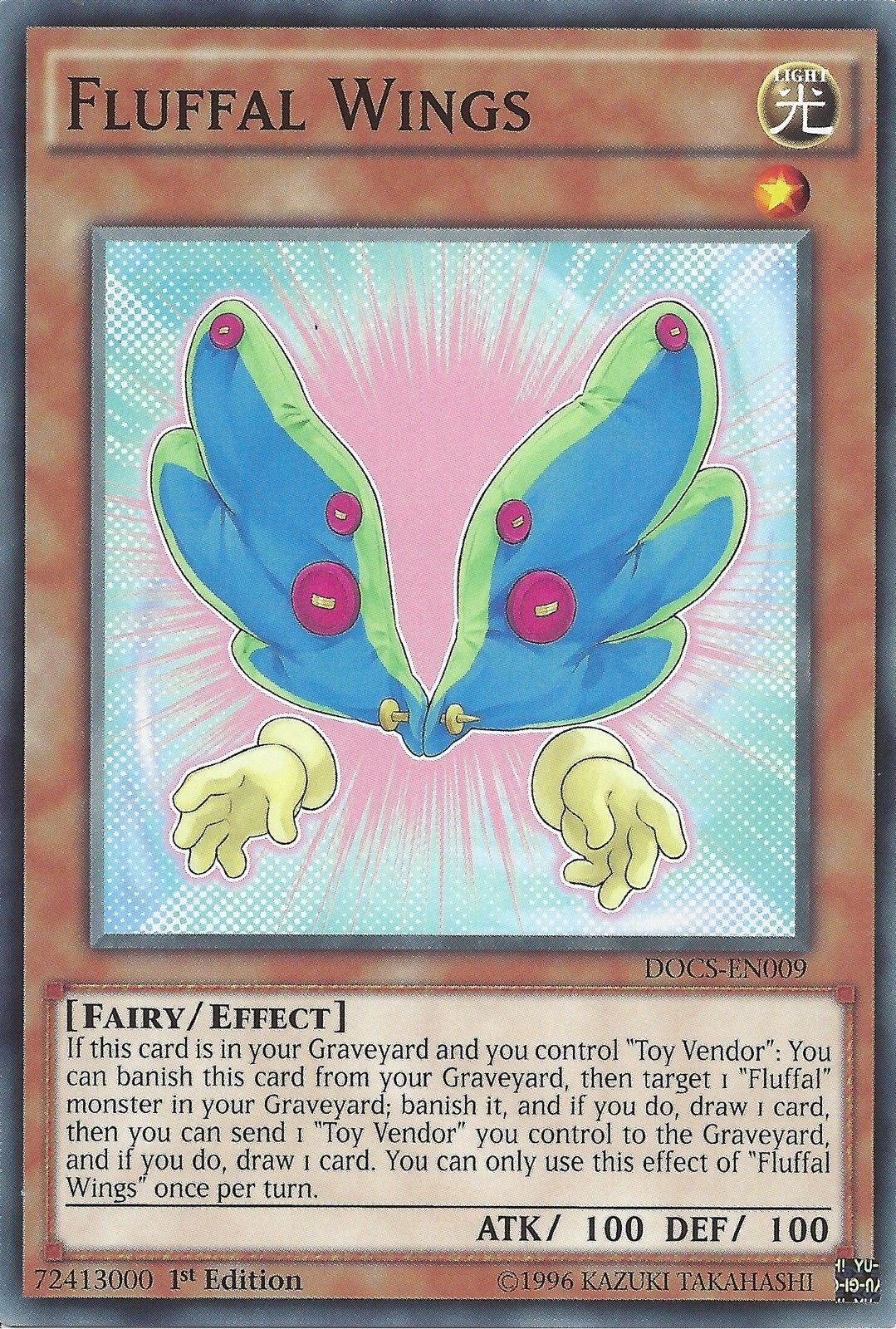 If this card is in your Graveyard and you control "Toy Vendor": You can banish this card from your Graveyard, then target 1 "Fluffal" monster in your Graveyard; banish it, and if you do, draw 1 card, then you can send 1 "Toy Vendor" you control to the Graveyard, and if you do, draw 1 card. You can only use this effect of "Fluffal Wings" once per turn.