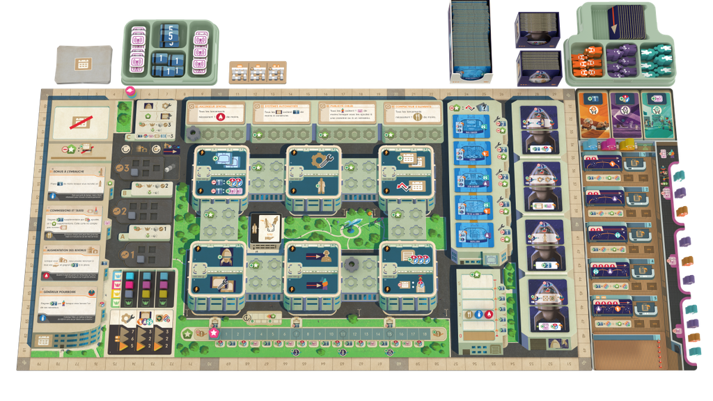 À votre tour, vous pouvez soit placer un travailleur pour effectuer deux actions dans le réseau en constante expansion, soit lancer un vaisseau et envoyer l'un de vos travailleurs dans l'espace en tant que pilote, soit rappeler tous vos travailleurs terrestres pour collecter des bonus de financement. Les actions comprennent l'acquisition de plans, la construction de vaisseaux, l'attraction d'invités et la construction de développements - des connexions entre les lieux qui augmentent le choix des actions tout au long du jeu.